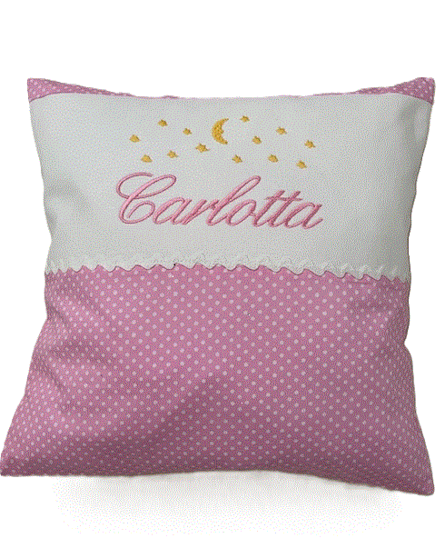 Hochwertiges, besticktes Kinderkissen aus rosa Baumwollstoff mit weißen Pünktchen. Im oberen Drittel ist ein weißer Baumwollstreifen eingesetzt.